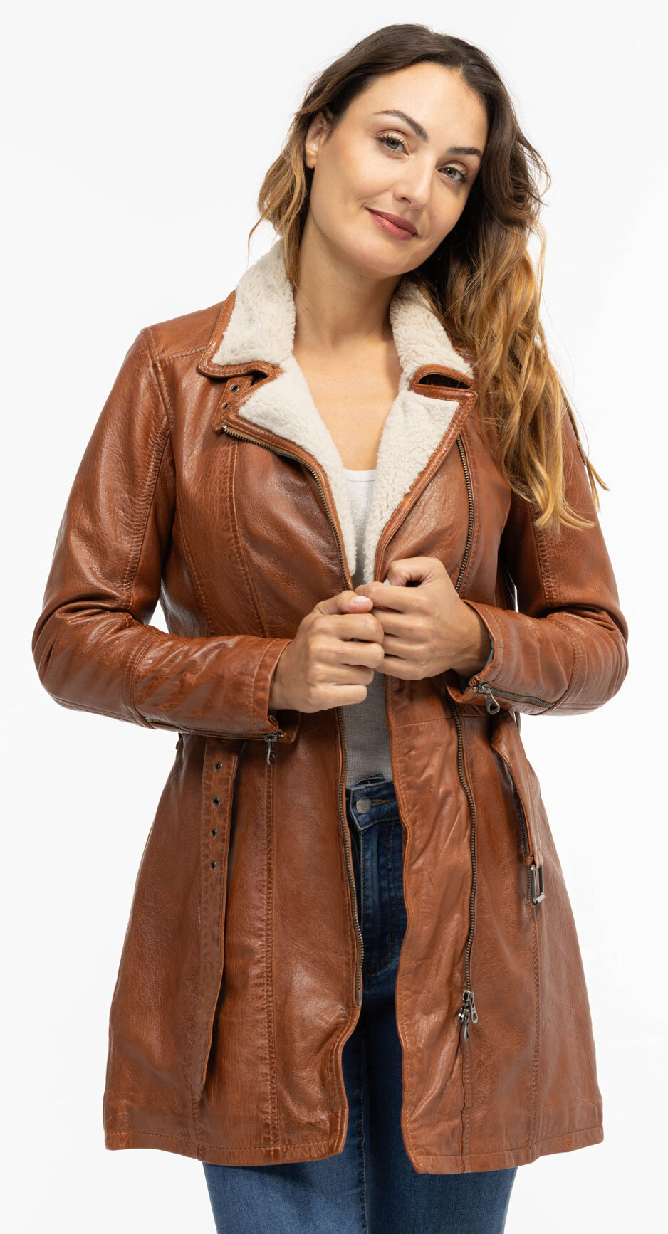 Largo tres cuartos en piel de cordero de curtido vegetal para mujer de la marca Gipsy. Tiene un cierre asimétrico, su cremallera también es acortada para una mayor libertad de movimientos y es bidireccional. Su cuello se puede llevar como sastre o con cuello vuelto, esta decorado con suave y calido pelo de imitacion de lana. Tienes dos bolsillos laterales con cremalleras, cremalleras en la parte inferior de las mangas. El tres cuartos lleva cinturon, para que puedas ajustar la prenda y marcar la cintura. Tienes el cuerpo y el forro de las mangas de poliéster, el cuello también es de poliéster. Permita un largo de espalda de 85 cm para la talla M y un largo de manga de 63 cm.