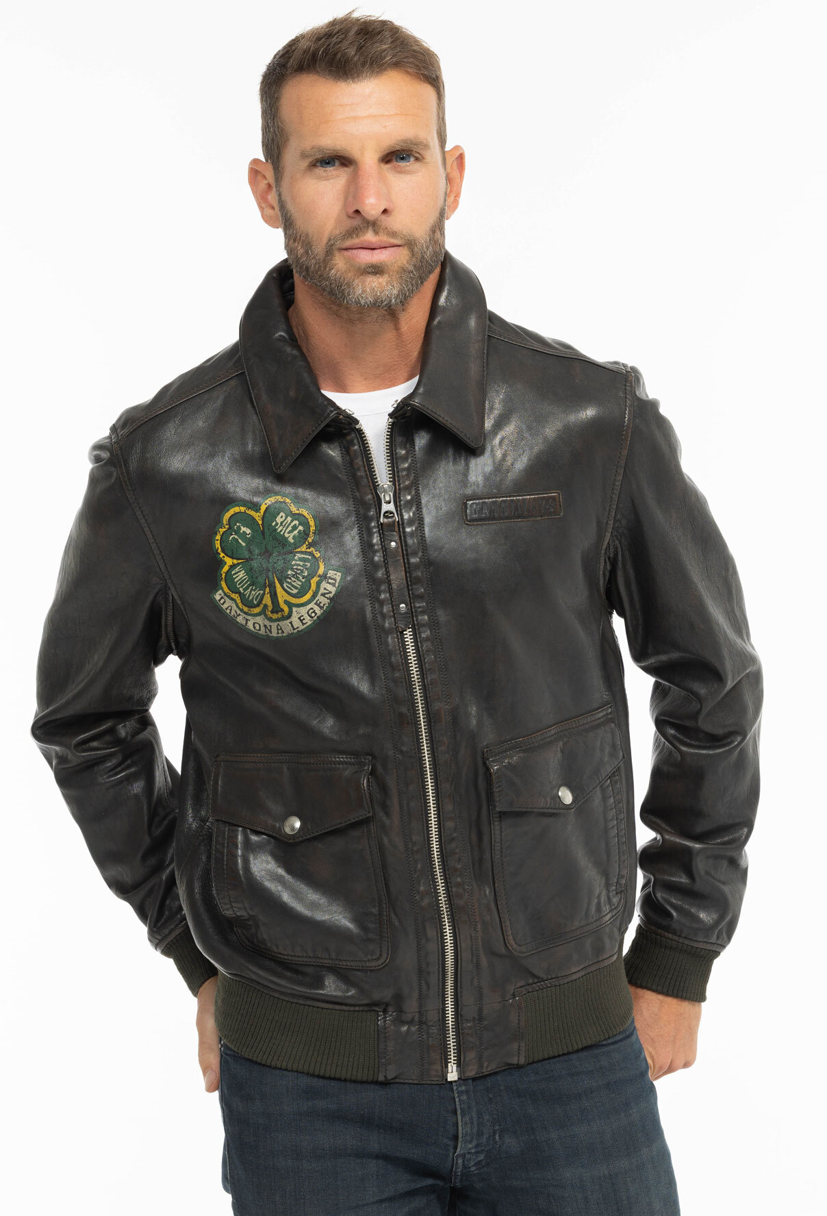 Chaqueta de piel de cordero en color negro envejecido para hombre de la marca Daytona. Encontramos un corte de espiritu "piloto" con punos y cinturilla de canalé, cierre central y 2 bolsillos de parche en la cintura. La chaqueta de cuero presenta cuello camisero, asi como un grafico "trébol" en el pecho y 1 parche bordado que recuerda la marca también en el pecho. En el interior el forro es de algodon certificado “THERMOCORE” con 3 bolsillos y poliéster para las mangas.