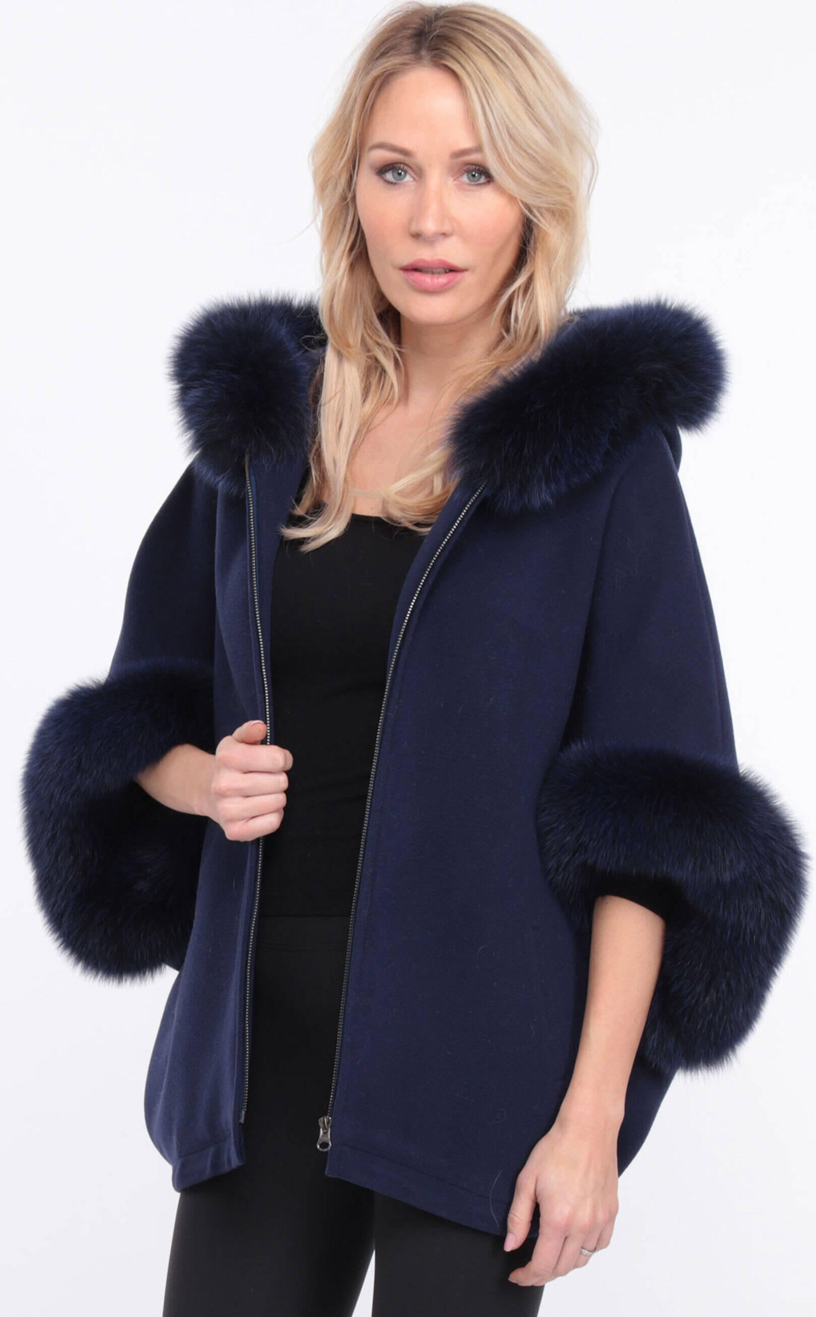 Chaqueta de tela de color azul marino para un poncho femenino con capuchas y punos en pelaje de zorro real. Nos gusta su lado elegante y elegante, su lado practico con su cremallera central, tienes 2 bolsillos en la cintura. Ideal en un atuendo elegante o relajado, te seducira.'