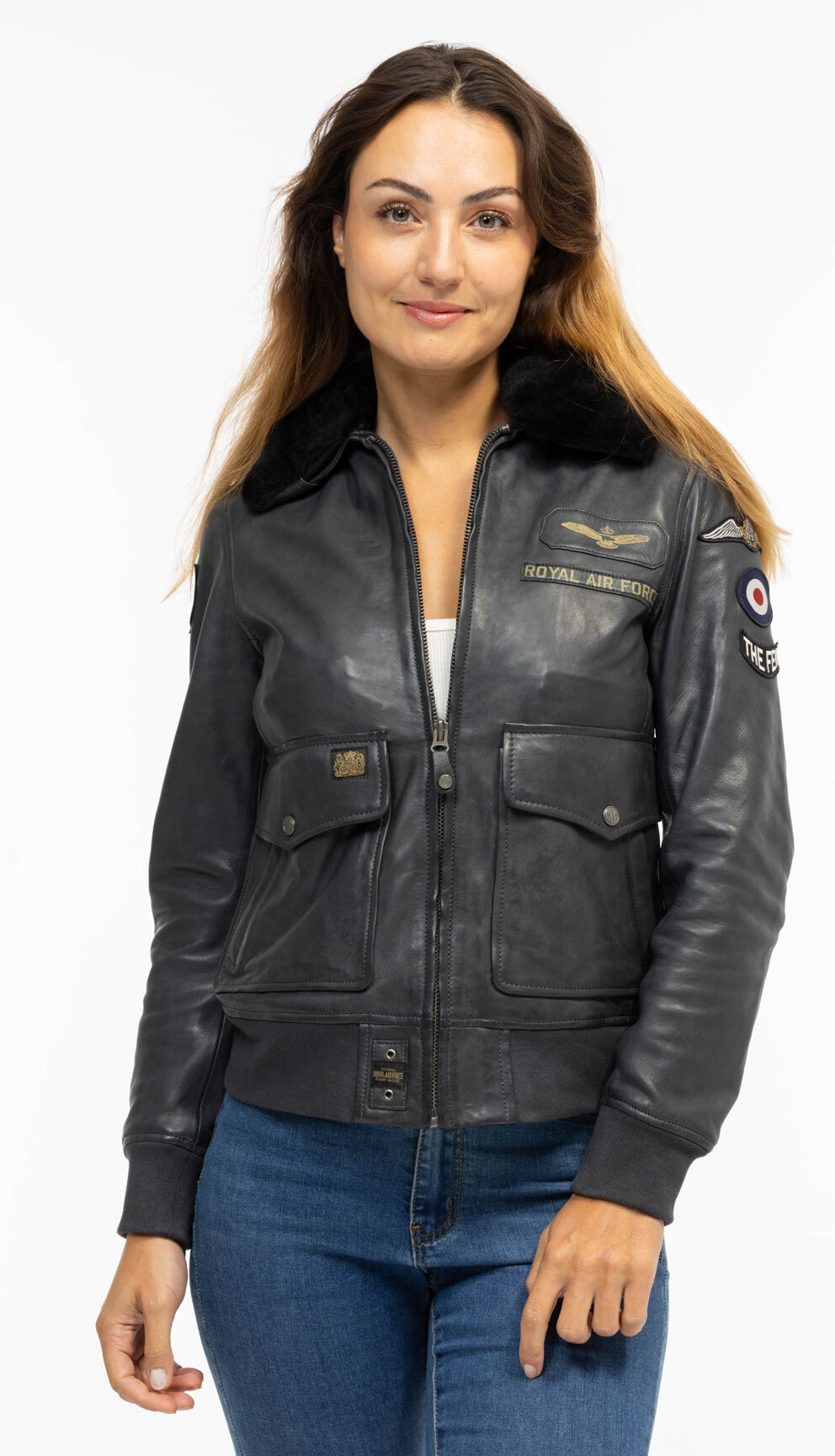 Cazadora de piel azul marino para mujer, estilo aviador de la royal air force