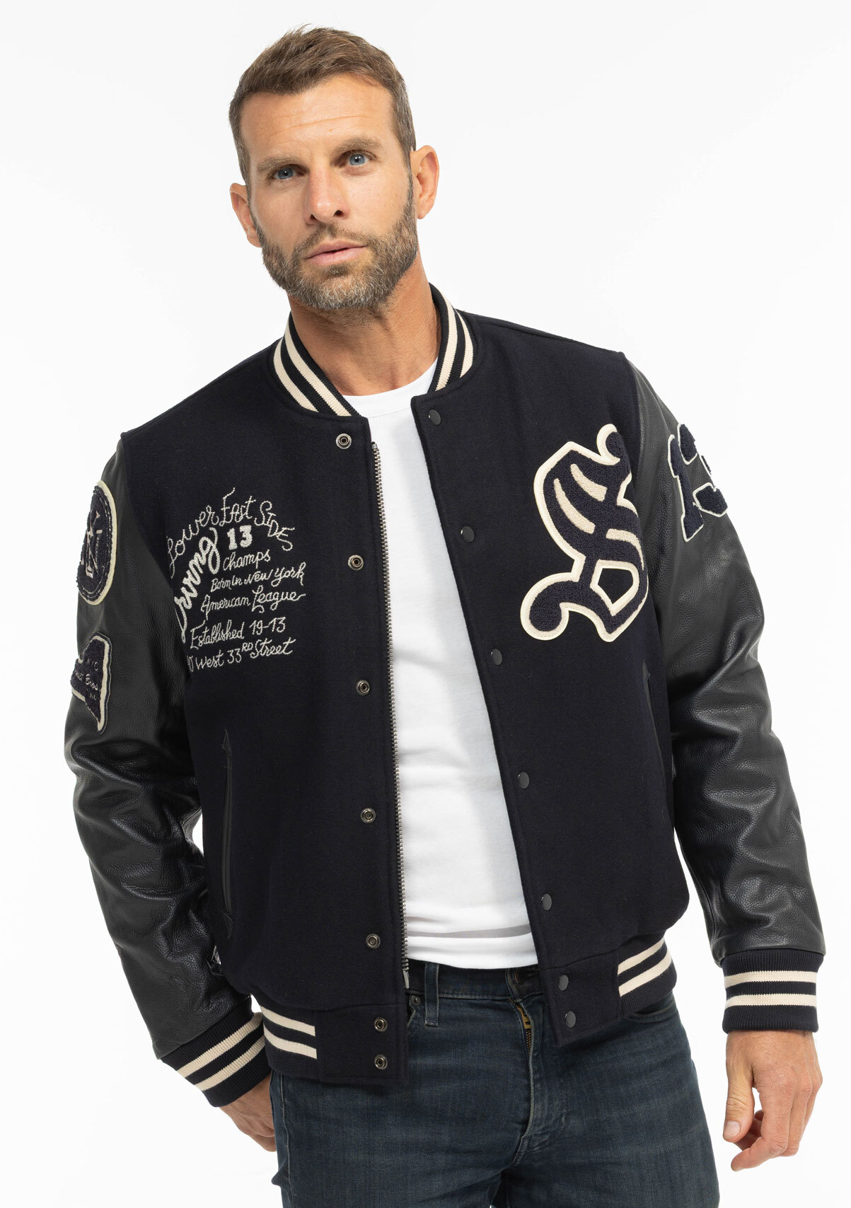 Chaqueta teddy de la nueva coleccion Schott, tiene un pequeno cuello mao de canalé, cierre de cremallera oculta por automaticos. Tienes insignias, bordados en el pecho, espalda y parte superior de las mangas. La chaqueta de cuero tiene dos bolsillos inclinados, en el borde acanalado de la cintura y en la parte inferior de las mangas. El cuerpo esta fabricado en 70% lana y 30% nailon y las mangas son de piel de vacuno.