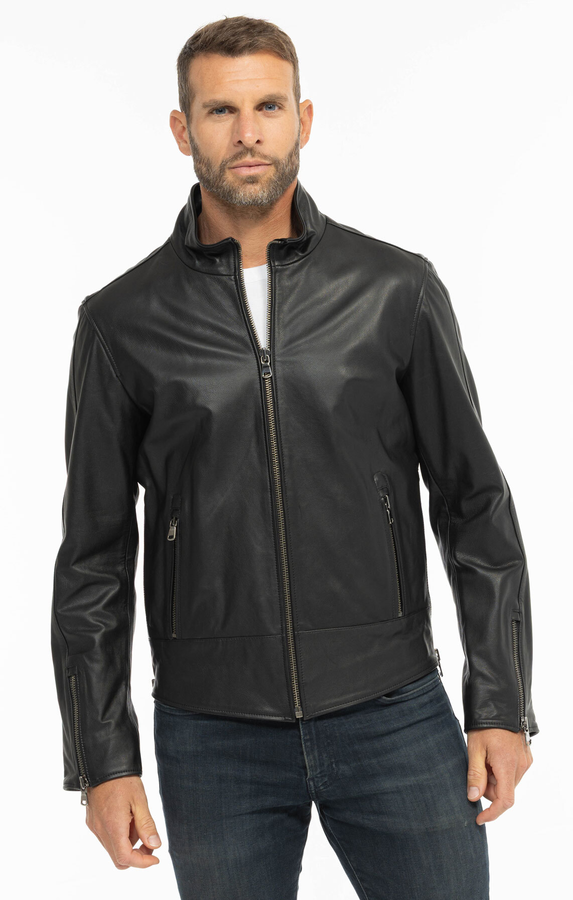 Chaqueta de piel de cordero negra para hombre. Nos encontramos con un corte regular y un estilo clasico, chic y atemporal que se puede llevar con un outfit casual como camiseta y jeans o con un outfit mas clasico como pantalon de algodon y camisa. La chaqueta de cuero tiene cuello alto, 2 bolsillos con cremallera en la cintura, cierres faciles en los lados de la chaqueta de cuero y un acabado con cierre en la parte posterior de las mangas. Se cierra con cremallera central y se abre sobre forro de poliéster y viscosa con 2 bolsillos interiores (1 con cierre y otro con boton). La piel de cordero de este modelo es mas gruesa de lo habitual pero sentimos una agradable comodidad y seguridad en cuanto a grosor. Permita una longitud corporal de 61 cm para una talla L.