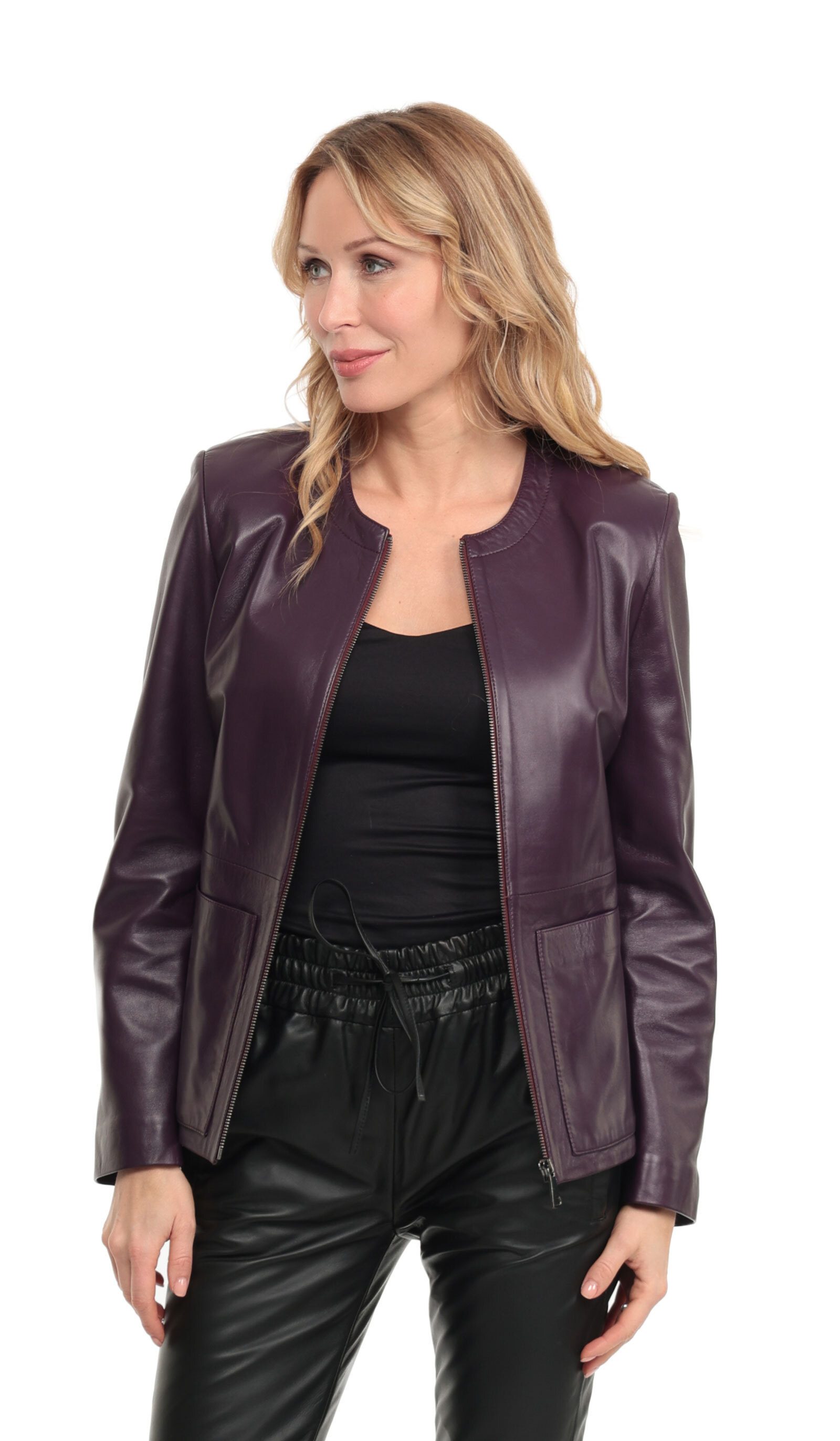 Chaqueta de cuero en cordero purpura para mujeres de la marca Cuirs Guignard. Hay un corte ajustado con un aspecto moderno y elegante. La chaqueta de cuero ingresa a los estilos "Spencer" con su famoso cuello redondo, tienes 2 bolsillos rectos chapados en la cintura. El cuero Spencer se cierra con una cremallera central. Sobre y va a todas partes, la chaqueta de cuero estilo Spencer se casara con un atuendo relajado como jeans o sublimo un atuendo mas clasico.