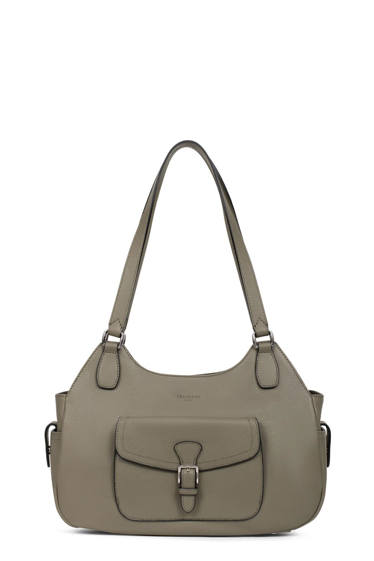Bolso de mano para mujer en piel de vacuno granulada de la marca Hexagona. Nos encontramos con un bolso de tamano mediano con un aspecto bastante chic y moderno al mismo tiempo. En el exterior hay 4 bolsillos (2 laterales con broches, 1 frontal con solapa + iman y 1 trasero con cremallera). El bolso se puede llevar al hombro o en la mano gracias a sus 2 asas. Tienes un acabado metalico en los accesorios como los broches, hebillas y cupulas debajo del bolso que sirven como refuerzos protectores para colocar el bolso en el suelo. El bolso de piel Hexagona se cierra con cremallera y se abre en un unico compartimento separado de un bolsillo con cremallera, ademas de varias zonas de almacenamiento en forma de bolsillos. El forro es sintético y las dimensiones del bolso son: