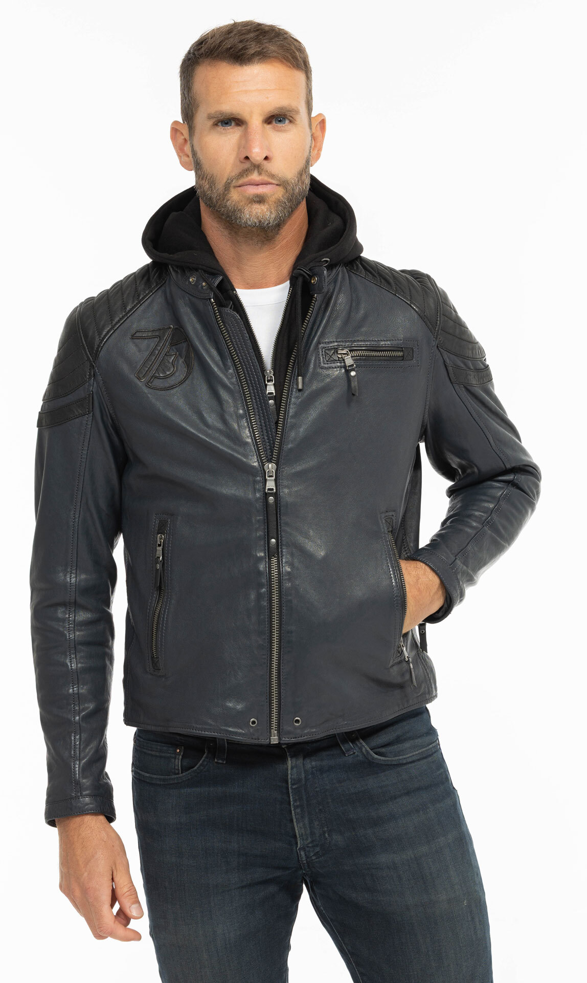 Chaqueta de hombre de la marca Daytona en piel de cordero, tiene capucha desmontable. Nos encontramos con un corte ligeramente entallado y piel suave con un look deportivo moderno. Su capota desmontable nos ofrece la posibilidad de dos looks, un lado deportivo con ella y un estilo motero sin ella. De hecho, es facilmente reconocible por su cuello mao con broche, sus costuras con efecto acolchado en los hombros y sus distintos parches en el pecho. La chaqueta de cuero se cierra con cremallera central, tiene un remate de cremallera en la parte posterior de la manga y un pequeno bolsillo con cremallera en el pecho. En la parte delantera también tienes dos bolsillos inclinados con cremallera, en el interior el forro es de algodon para el cuerpo con 3 bolsillos y de poliéster para las mangas.