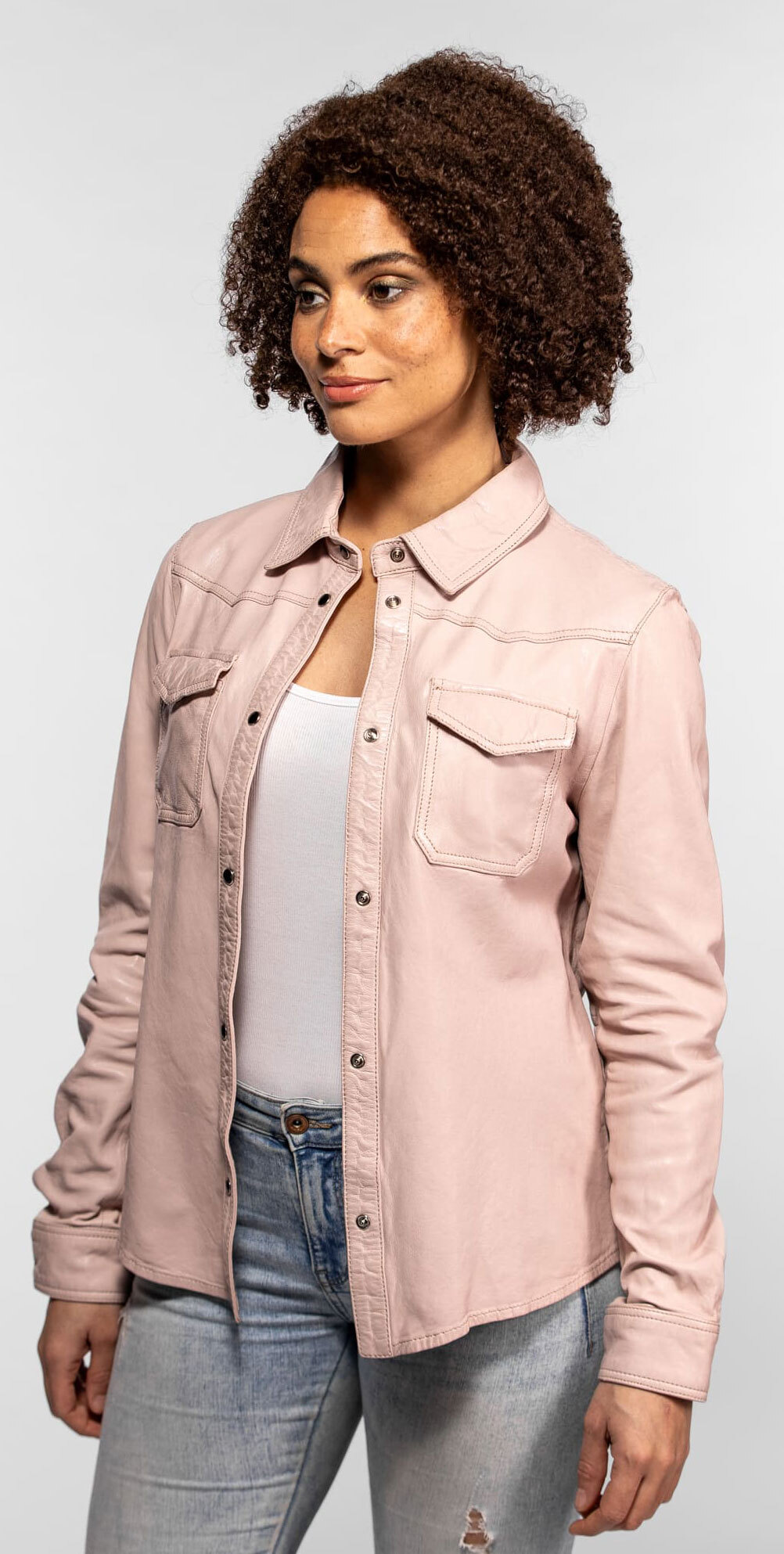 Adoptar esta camisa de cuero para mujer en polvo es adoptar una pieza hibrida con multiples facetas. Nuestra experiencia como conservador nos llevo a este modelo por la calidad excepcional de su cordero, de una finura poco comun. Se puede llevar sobre la piel para un look sensual o como sobrecamisa abierta para un look decididamente rockero. No es una simple prenda, sino una prenda de caracter que se adapta a tu vida, desde la oficina hasta las veladas mas atrevidas.