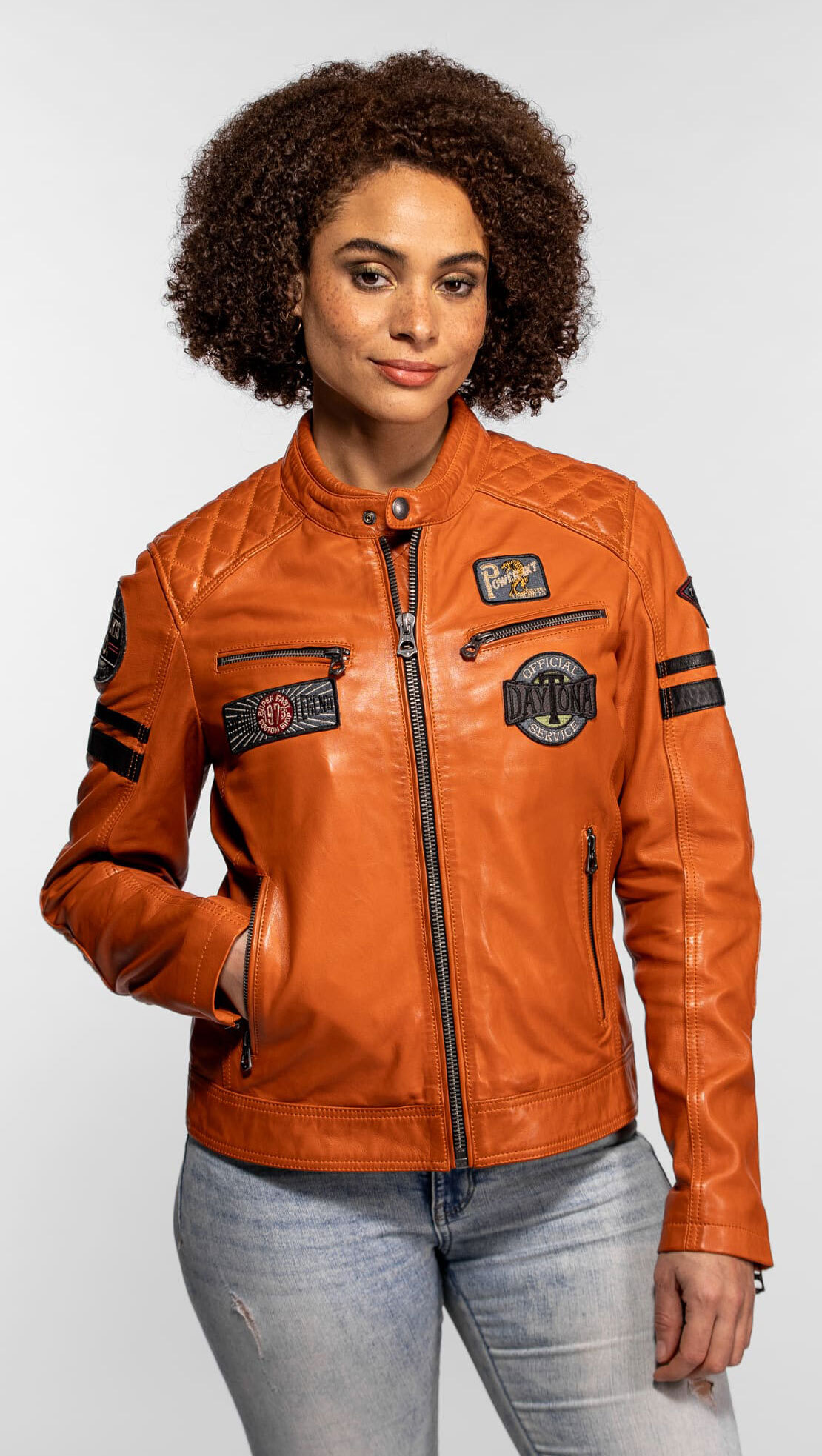 Chaqueta de piel estilo biker naranja de mujer Daytona